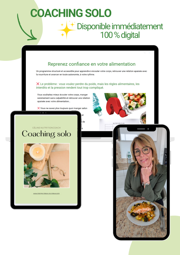 Avec le Coaching Solo, vous progressez en toute autonomie, tout en bénéficiant d’un cadre clair et rassurant. Vous apprenez à écouter votre corps, retrouver des repères et construire une relation apaisée avec l’alimentation.
