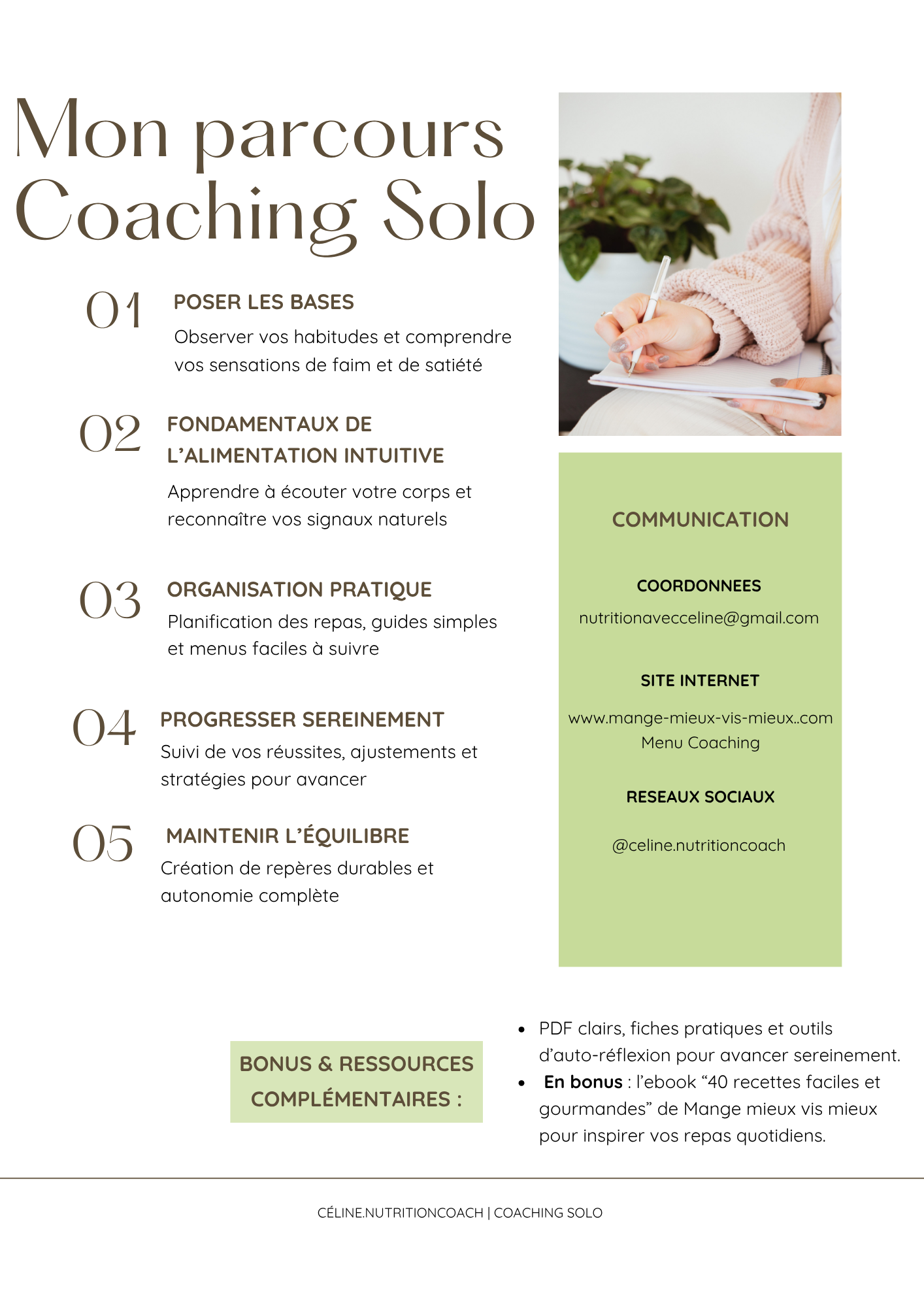 Le Coaching Solo est un programme guidé et structuré conçu pour vous permettre, après réception et remplissage du questionnaire, d’obtenir un coaching totalement personnalisé, sans régime ni restrictions strictes.
